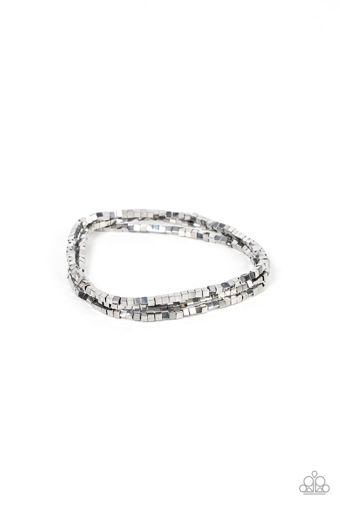 A dainty collection of silver cube beads alternates along stretchy bands, stacking into edgy layers around the wrist.