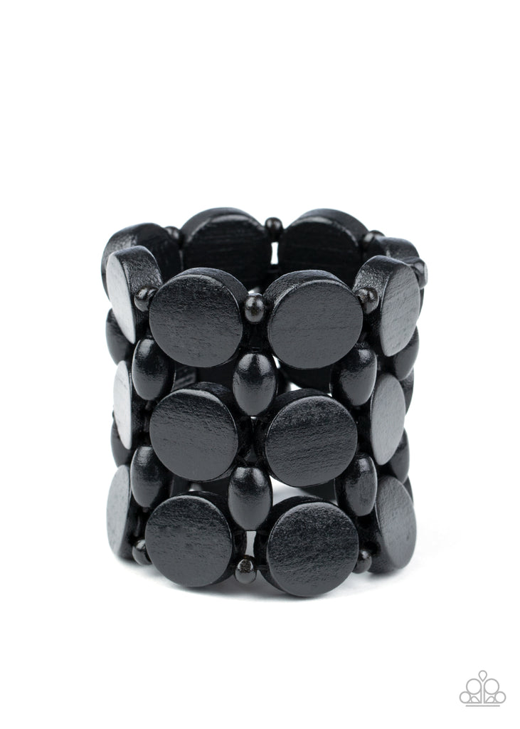 Featuring disc, oval, and rounded shapes, a mismatched collection of shiny black wooden beads are threaded along knotted stretchy strands, creating a tropical inspired look around the wrist.