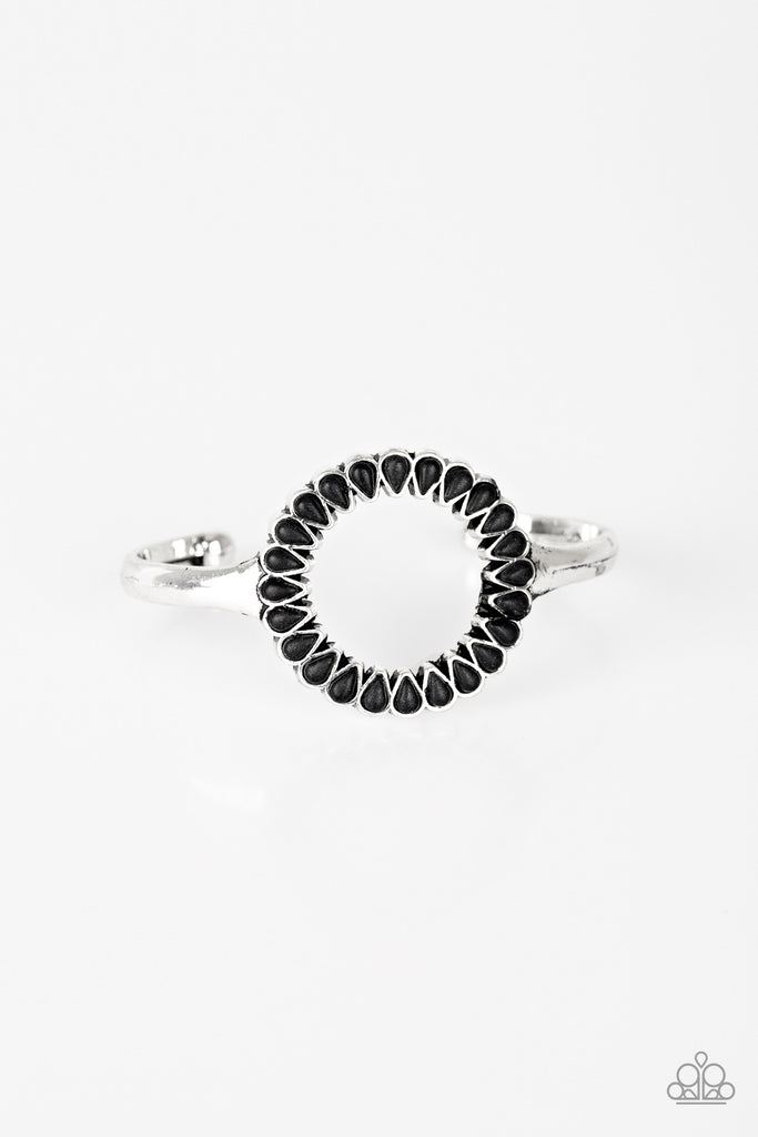 Chiseled into tranquil teardrops, earthy black stones spin around the center of an antiqued silver cuff for a seasonal look.
