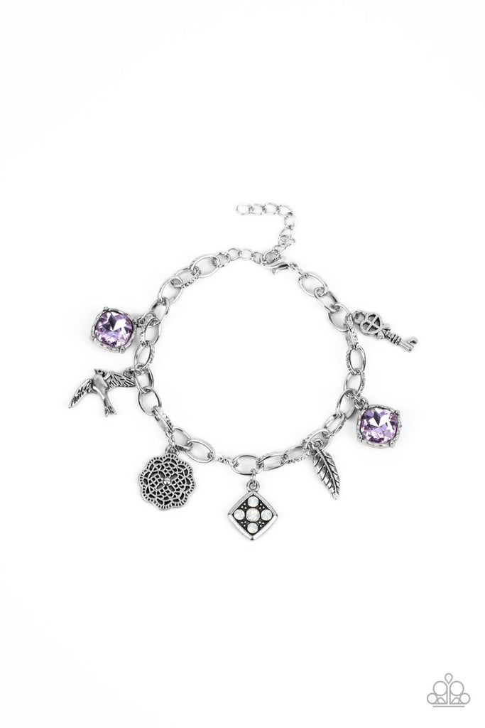 Sparkling purple gems, a floral medallion, a bird in flight, and a fluttering feather dangle from a delicate silver chain as they coalesce into a whimsical charm bracelet. Features an adjustable clasp closure.