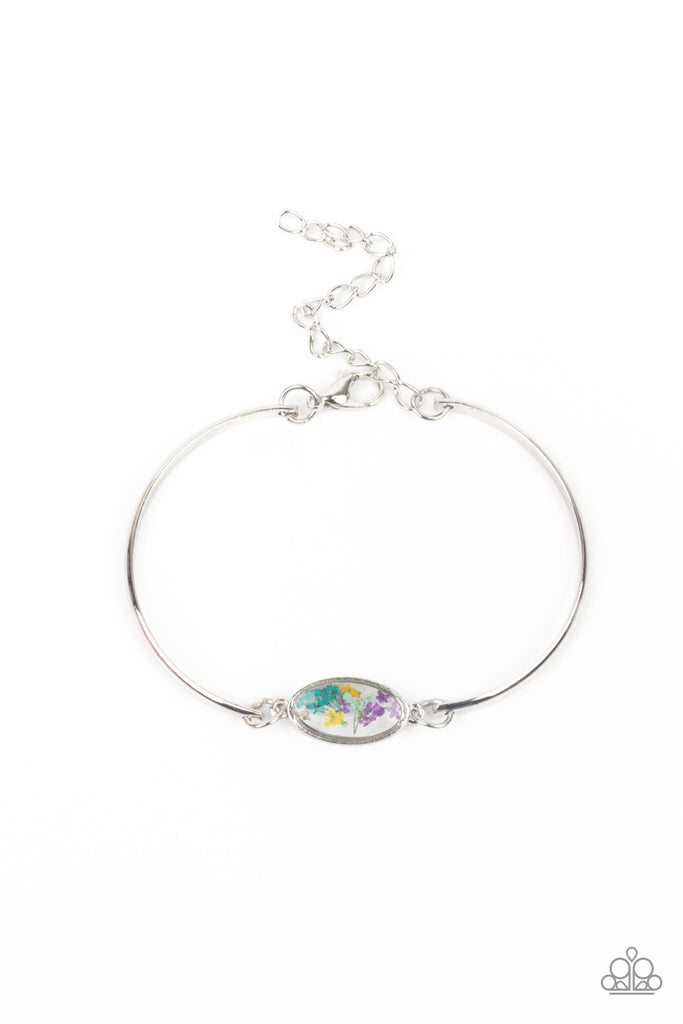 A collection of colorful wildflowers is encased in a glassy casing bordered in silver that attaches to two shiny silver bars around the wrist, creating a whimsically dainty centerpiece. Features an adjustable clasp closure.