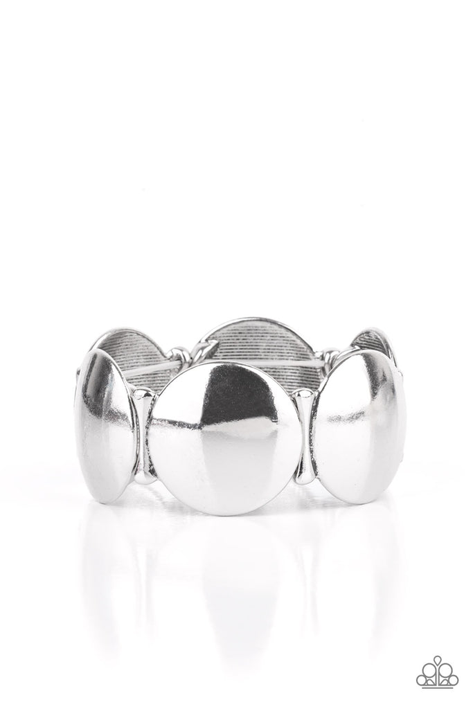 Infused with curved bar-like accents, a shiny series of beveled silver discs are threaded along stretchy bands around the wrist for a bubbly metallic look.