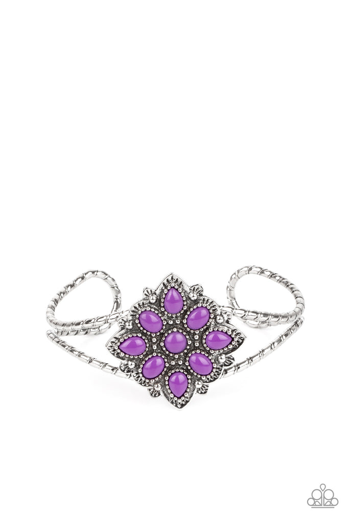 Purple teardrop beads embellish a decoratively studded frame atop a textured silver cuff, creating a whimsical pop of color atop the wrist.