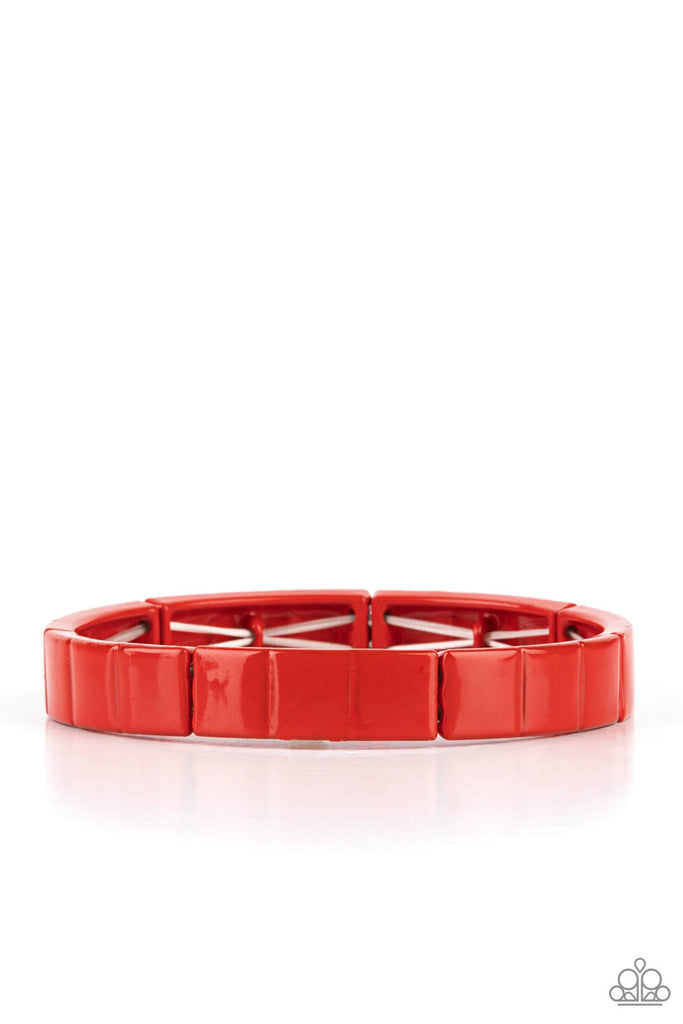Metal rectangles painted in a fiery red finish are threaded along stretchy bands, forming a gorgeous pop of color that wraps around the wrist.