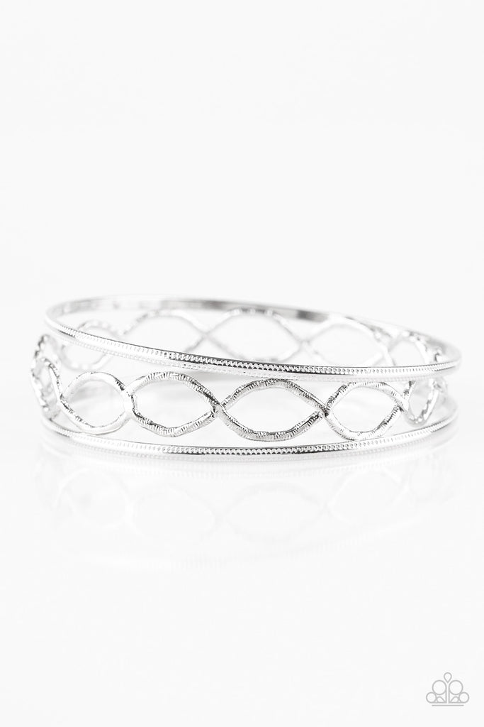 Featuring serrated textures, mismatched silver bangles stack across the wrist for a casual look.