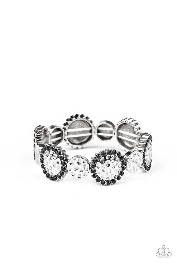 Ringed in glittery black rhinestones, hammered silver frames alternate with dainty hammered discs along stretchy bands around the wrist for a refined flair.