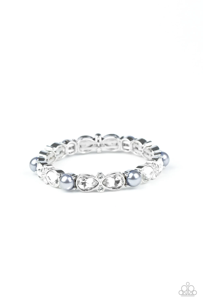 Dotted with dainty white rhinestones, pairs of glittery teardrop rhinestones join into sparkling frames along stretchy bands. Pearly gray beads are added to the display, adding a dash of refinement to the wrist.