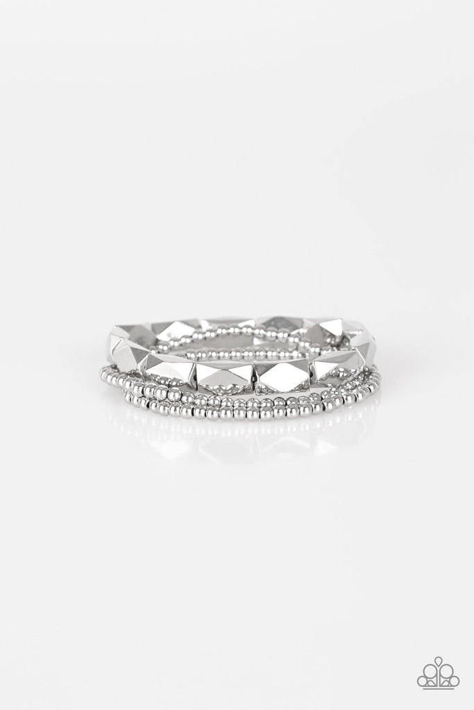 Dainty silver beads and faceted silver accents are threaded along stretchy bands and stacked across the wrist for a bold industrial look.