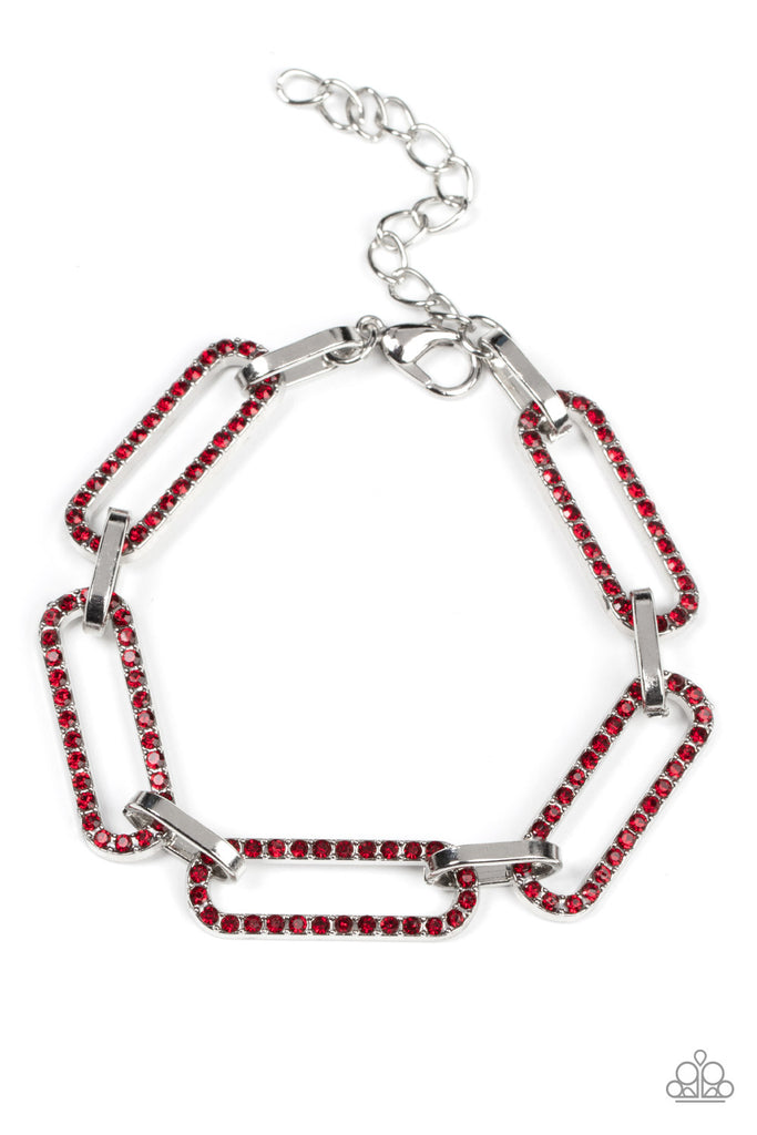 Dotted in dainty red rhinestones, oblong silver frames link with shiny silver fittings around the wrist for a timeless twinkle. Features an adjustable clasp closure.