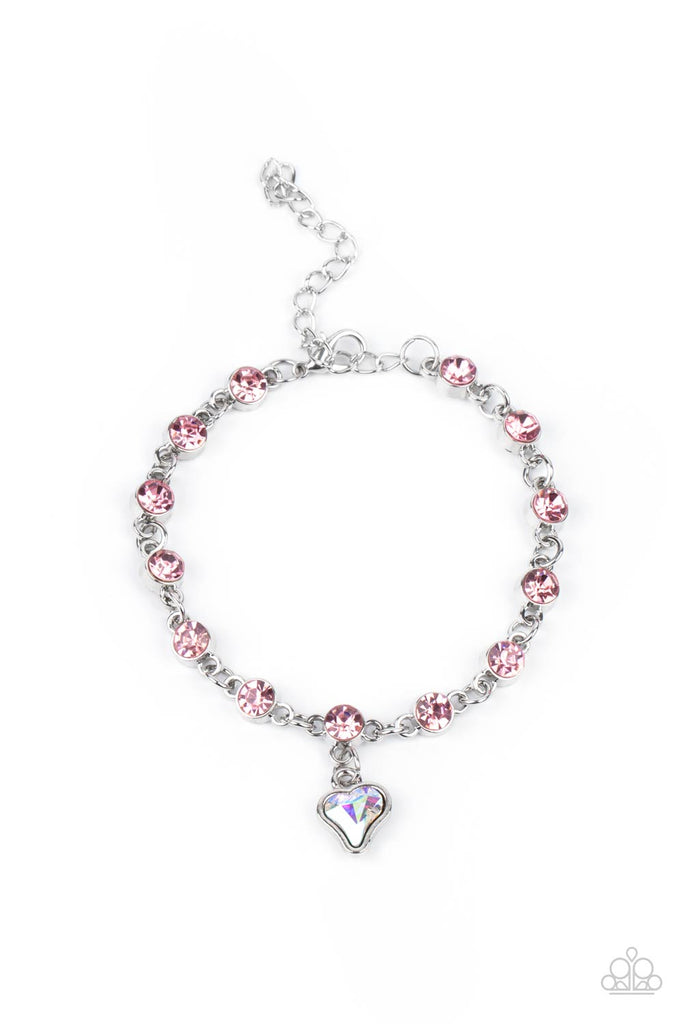 Brilliant pink rhinestones in shiny silver settings are linked together and accented with a charming iridescent rhinestone heart that dangles sweetly from the wrist. Features an adjustable clasp closure.