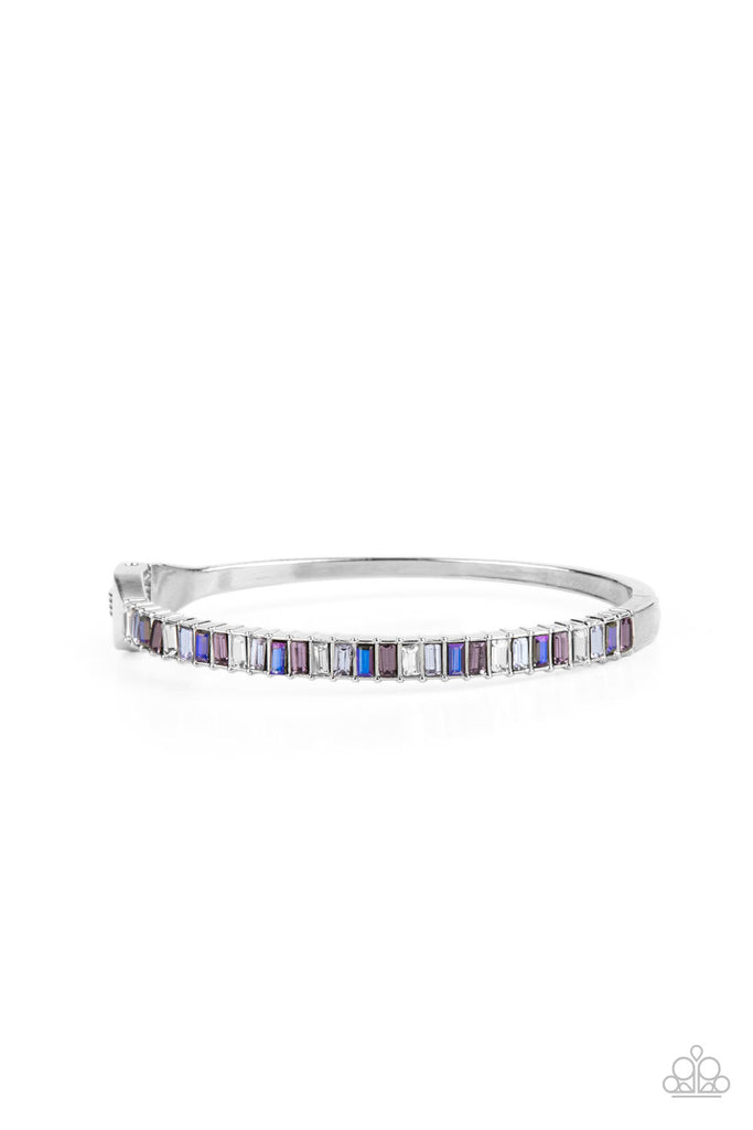 Featuring regal emerald style cuts, a dainty row of purple, white, and blue rhinestones are encrusted across the front of a silver cuff-like bangle for a timeless fashion. Features a hinged closure.