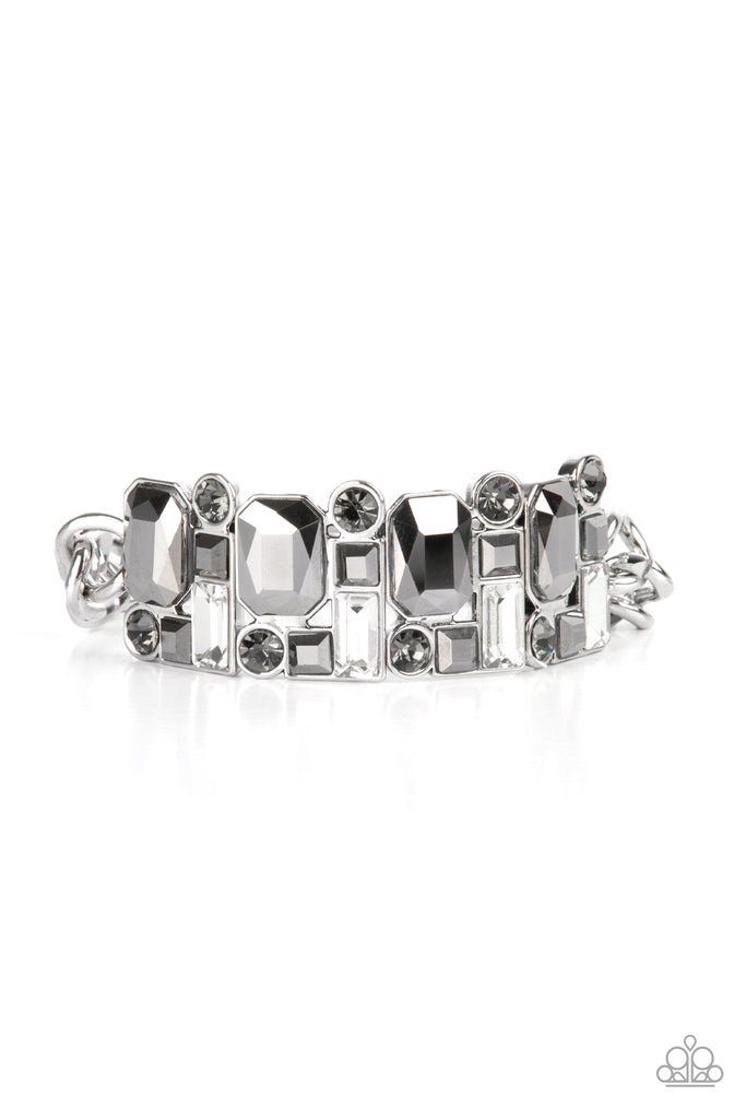 A mismatched collision of hematite, smoky, and white rhinestone encrusted frames are threaded along a stretchy band that attaches to a chunky strand of silver chain, creating jaw-dropping dazzle across the front of the wrist.