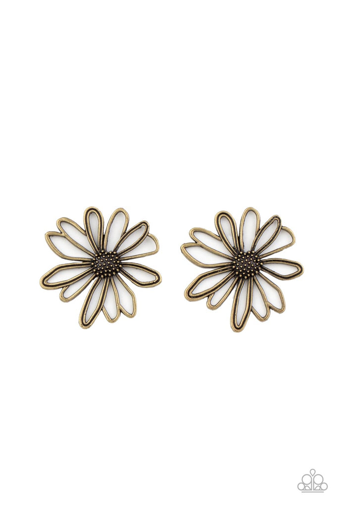 Airy brass petals bloom from a studded brass center, creating a rustic flower. Earring attaches to a standard post fitting.
