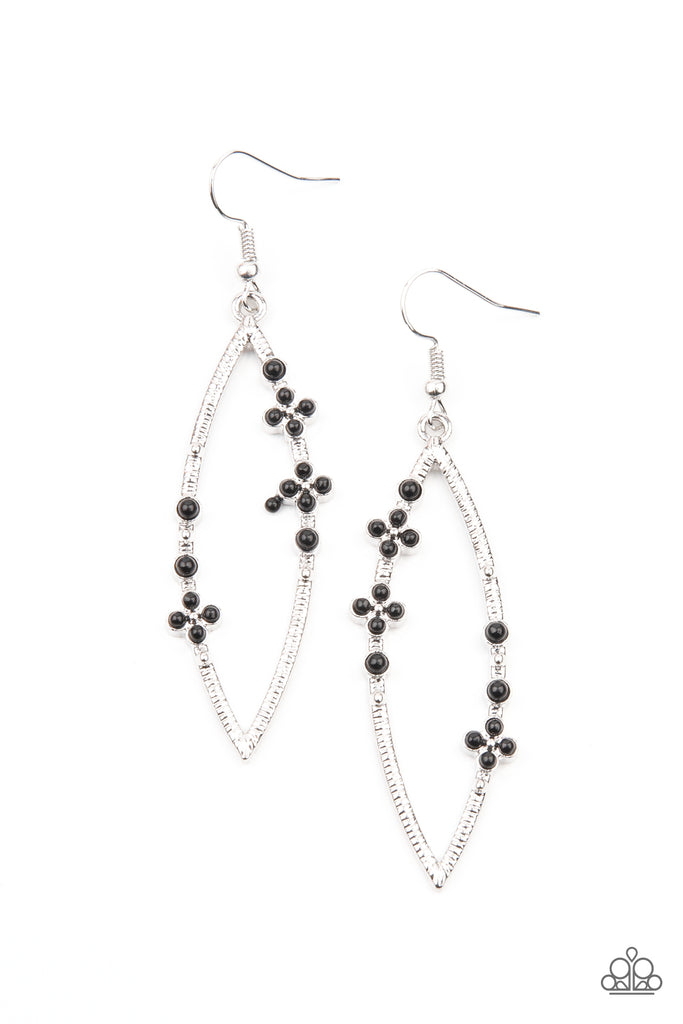 Dainty black beads adorn the front of a textured silver frame, creating colorful floral accents. Earring attaches to a standard fishhook fitting.