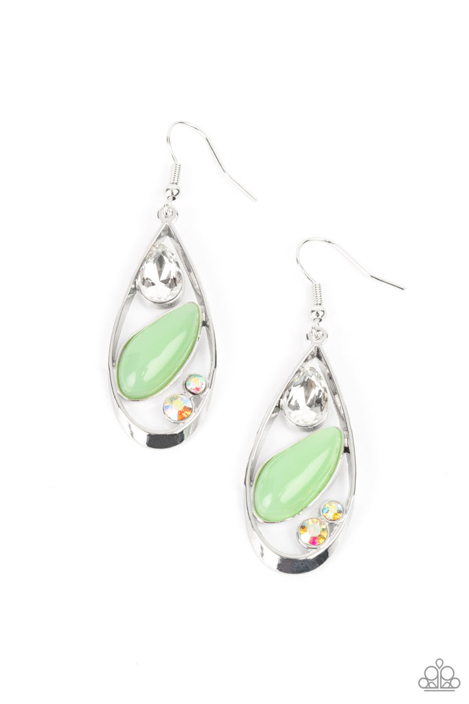 A silver teardrop frame embraces a collection of iridescent rhinestones and a milky Green Ash bead that is reminiscent of seashore finds. Earring attaches to a standard fishhook fitting.