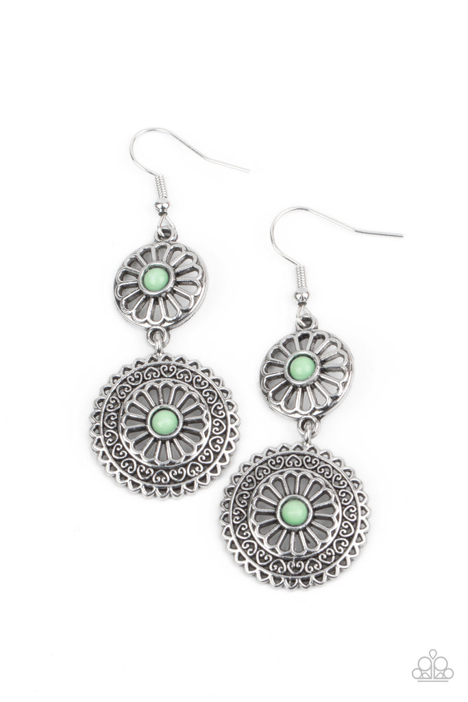 Dainty Green Ash beads adorn the centers of floral patterned silver frames that link into a whimsical lure. Earring attaches to a standard fishhook fitting.