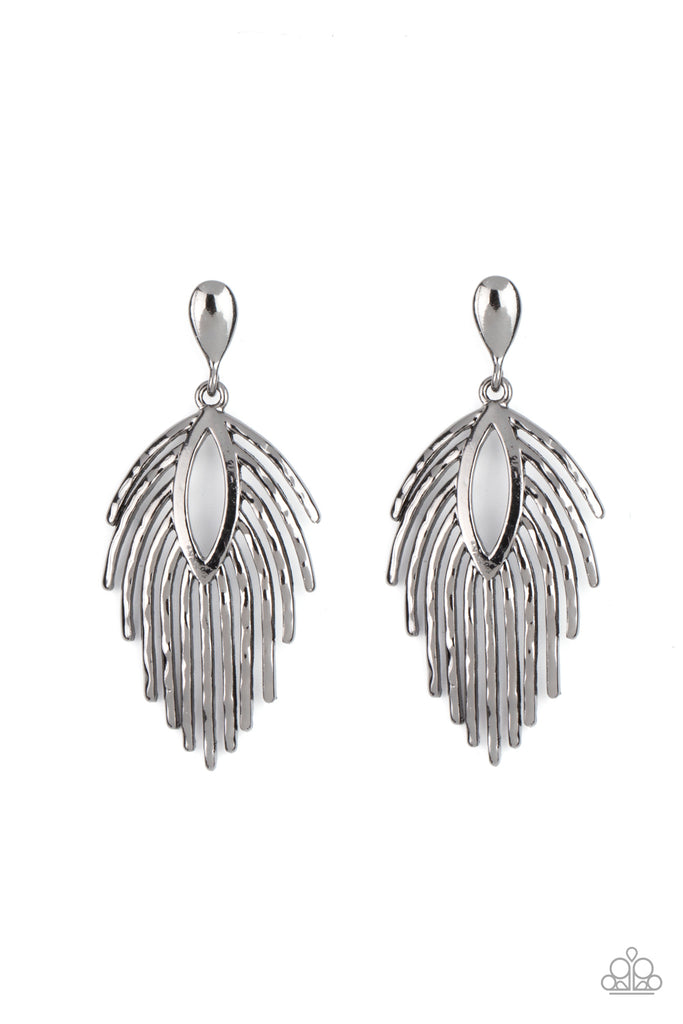 Anchored by a solid gunmetal bulb, gunmetal bars flare out and fall like shooting stars from an open marquise frame creating a captivating allure. Earring attaches to a standard post fitting.