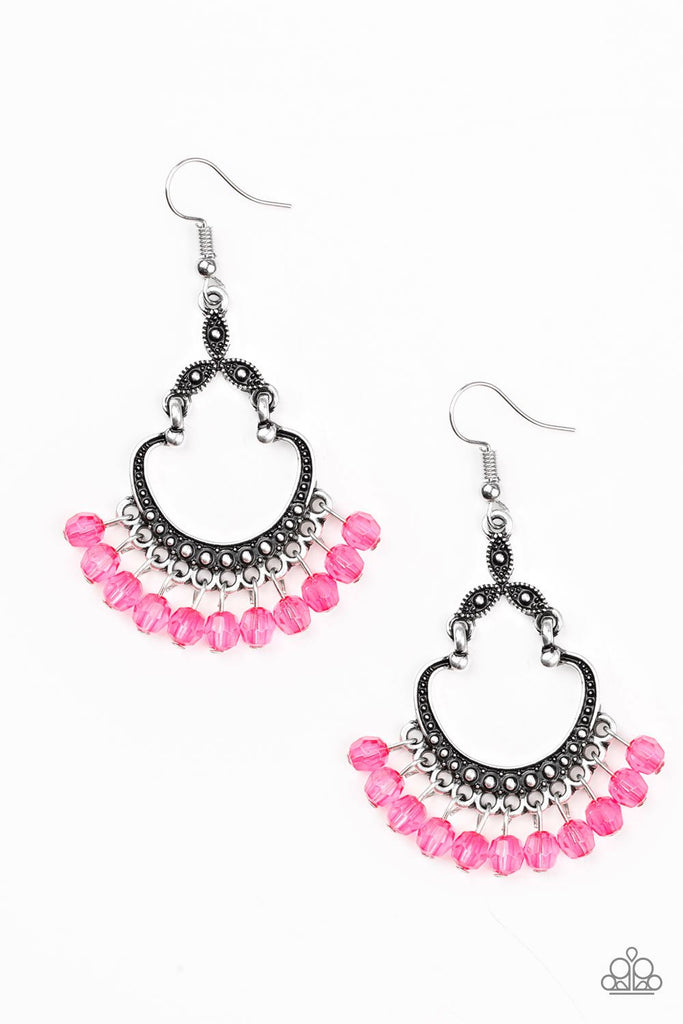 Faceted pink beads swing from the bottom of a studded silver frame, creating a whimsical lure. Earring attaches to a standard fishhook fitting.