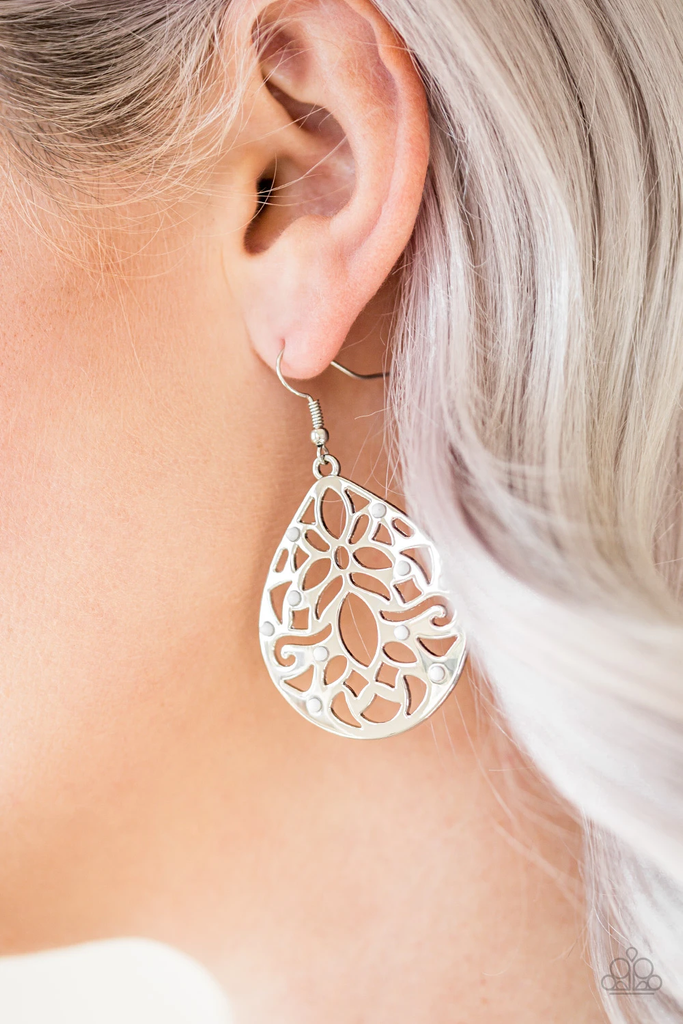 Dainty white beads are sprinkled along a stenciled silver teardrop, creating a whimsical lure. Earring attaches to a standard fishhook fitting.