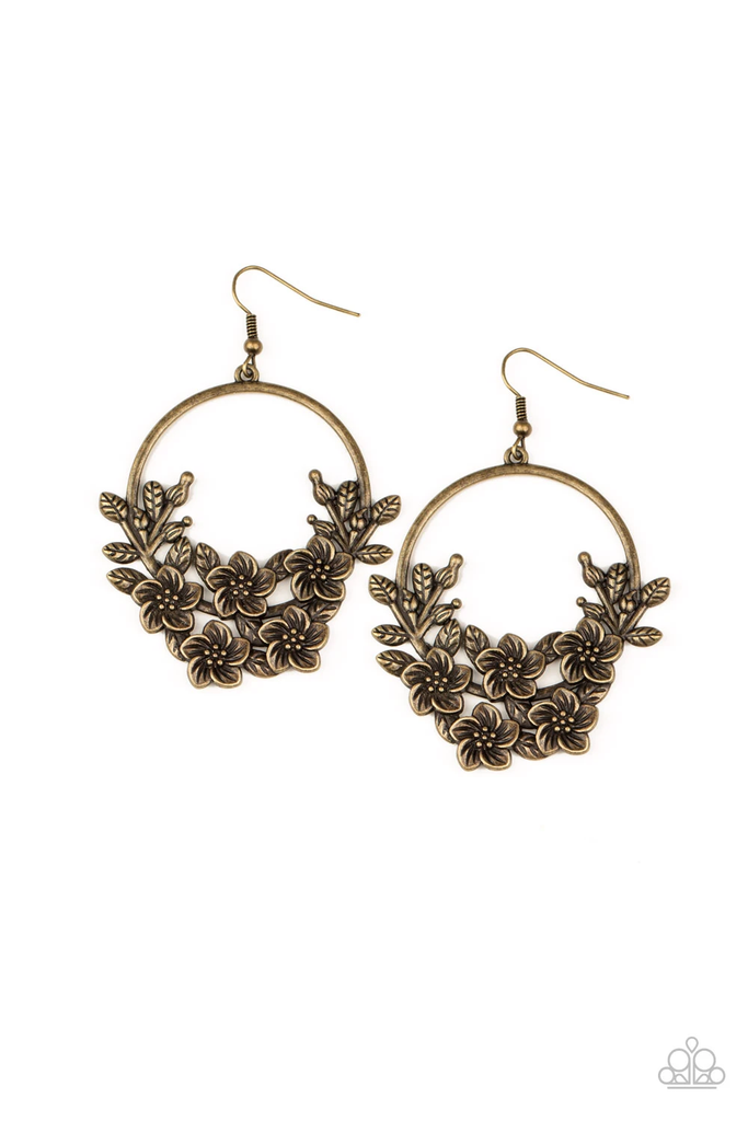 Leafy floral frames climb the bottom of an antiqued brass hoop, creating a whimsical frame. Earring attaches to a standard fishhook fitting.