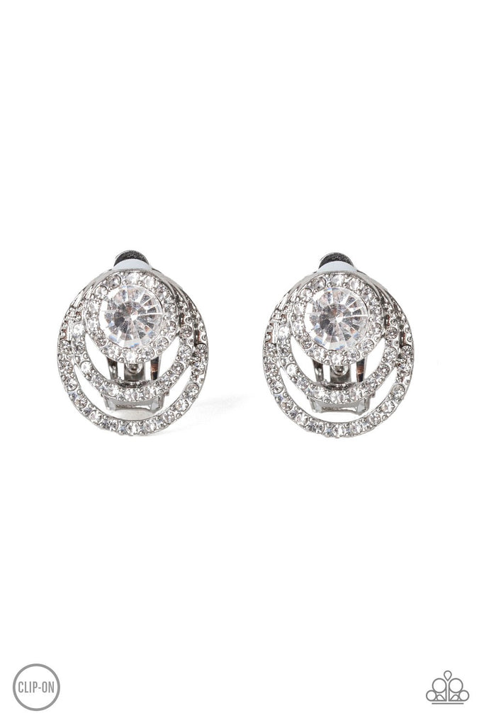 Encrusted in glittery white rhinestones, glistening silver rings circle around a solitaire white rhinestone for a refined look. Earring attaches to a standard clip-on fitting.