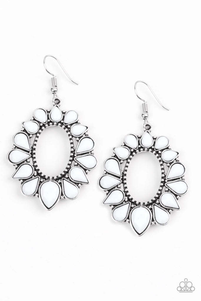 Faceted white teardrops flare from a studded silver hoop, coalescing into a flirty frame. Earring attaches to a standard fishhook fitting.