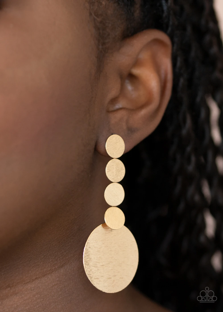 Featuring a delicately scratched surface, a row of dainty gold discs connects to a large gold disc, creating a bold display. Earring attaches to a standard post fitting.