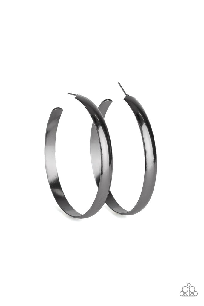 Brushed in a high-sheen shimmer, a flat gunmetal bar curls into a classic hoop for a timeless sheen. Earring attaches to a standard post fitting. Hoop measures approximately 2 1/2" in diameter.