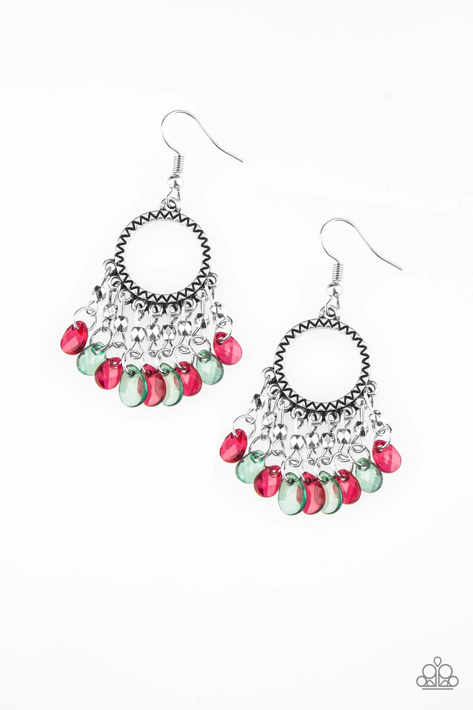 Glassy green and red teardrops and faceted silver beads swing from the bottom of a shimmery silver hoop radiating with sunburst patterns for a whimsical look. Earring attaches to a standard fishhook fitting.