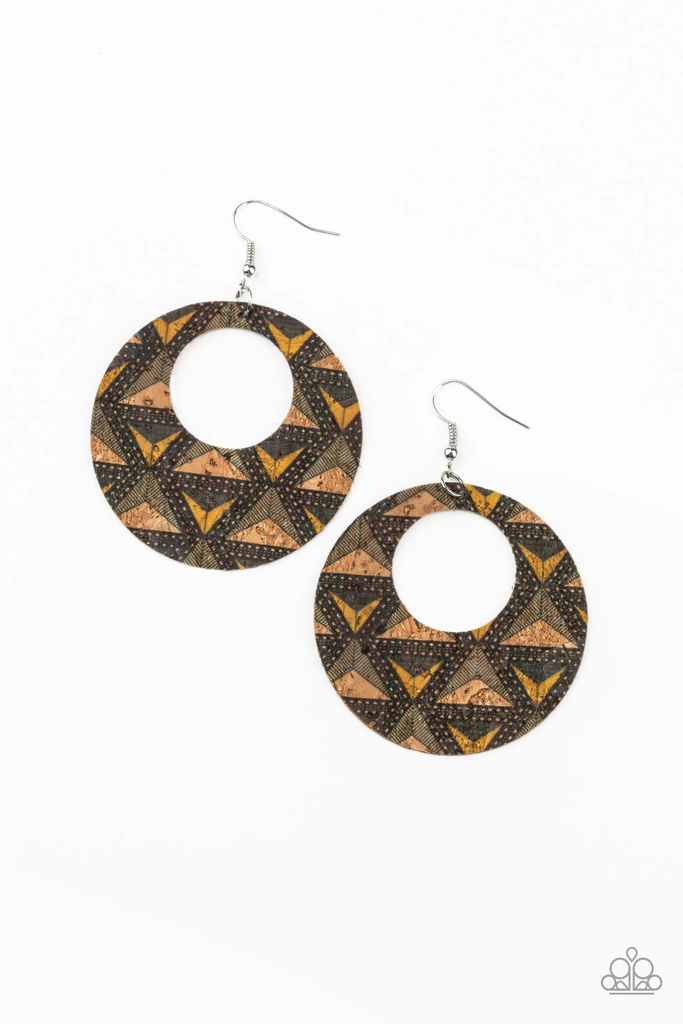 Featuring colorful geometric detail, a cork-like hoop swings from the ear for a seasonal look. Earring attaches to a standard fishhook fitting.