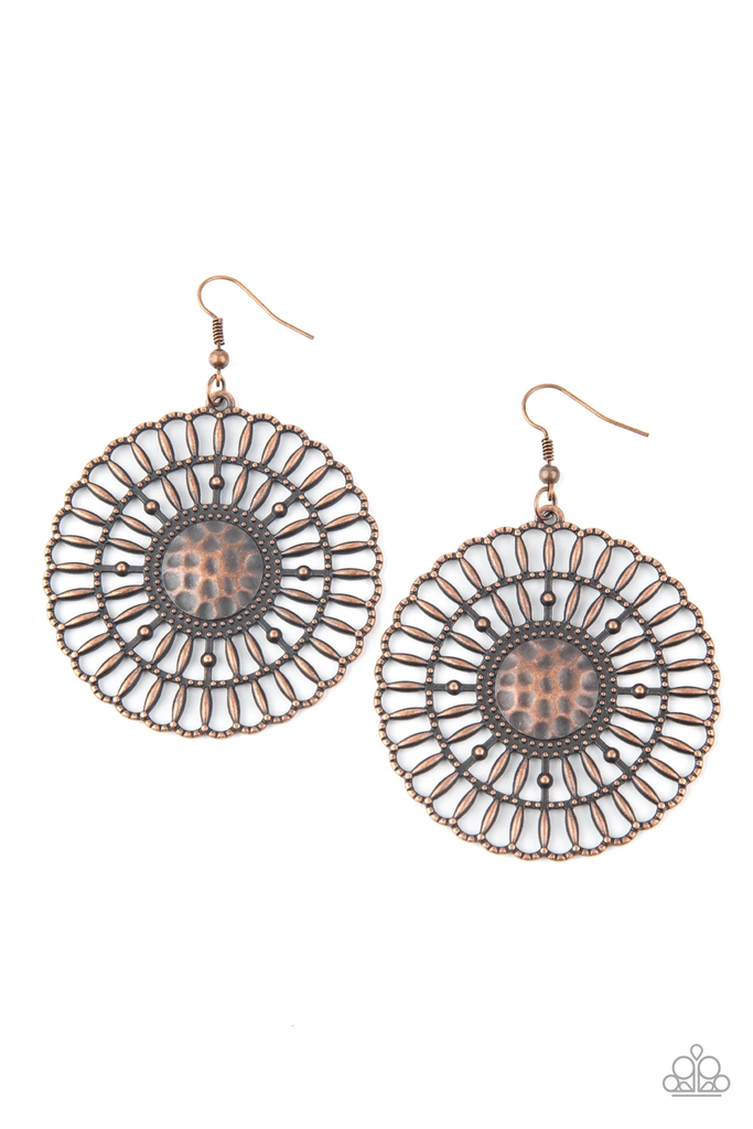 Rustic copper bars fan out from a studded and hammered copper center, coalescing into an airy scalloped frame. Earring attaches to a standard fishhook fitting.
