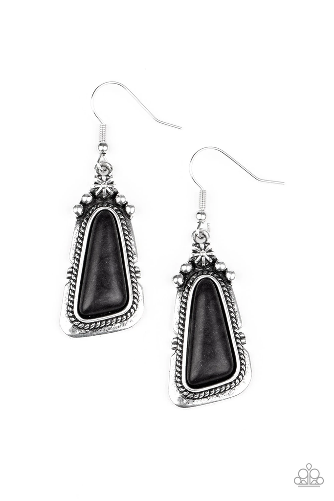 An imperfect black stone is pressed into the center of a studded silver frame featuring silver rope-like texture. Earring attaches to a standard fishhook fitting.