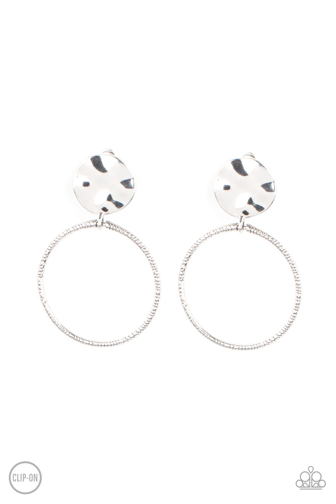 A textured silver hoop attaches to a hammered silver disc, creating an edgy hoop. Earring attaches to a standard clip-on fitting.
