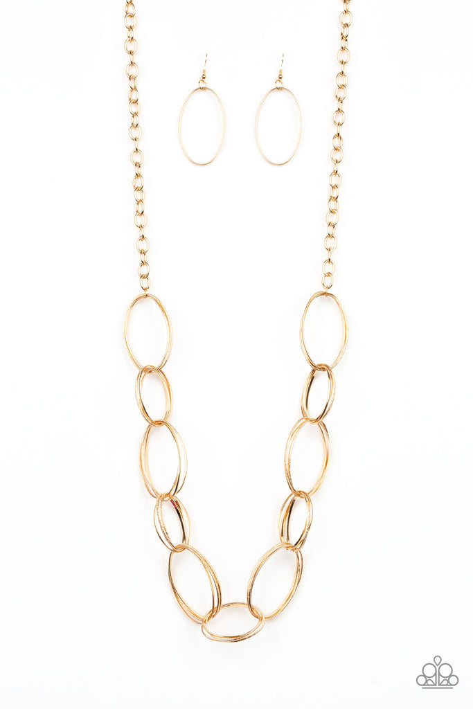 A collision of smooth and hammered gold oval links connect across the chest for a dramatic industrial look. Features an adjustable clasp closure.