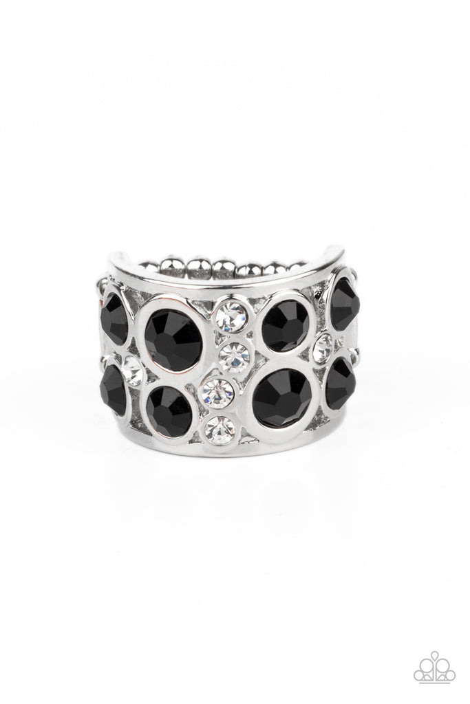 Sporadic sections of dainty white rhinestones and oversized black rhinestones haphazardly coalesce inside an airy silver frame, creating a dramatically dazzling centerpiece around the finger. Features a stretchy band for a flexible fit.