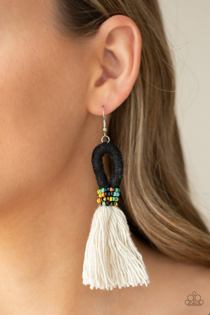 A tassel of soft white cotton fans out under rows of brightly colored seed beads. Anchored by a loop of jet black floss, the eye-catching style swings from the ear for a show-stopping statement. Earring attaches to a standard fishhook fitting.