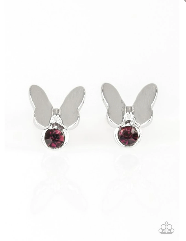 Silver butterfly with a colorful gem on a standard post fitting. Vary by color, yellow, green, white, blue, purple, red, pink.