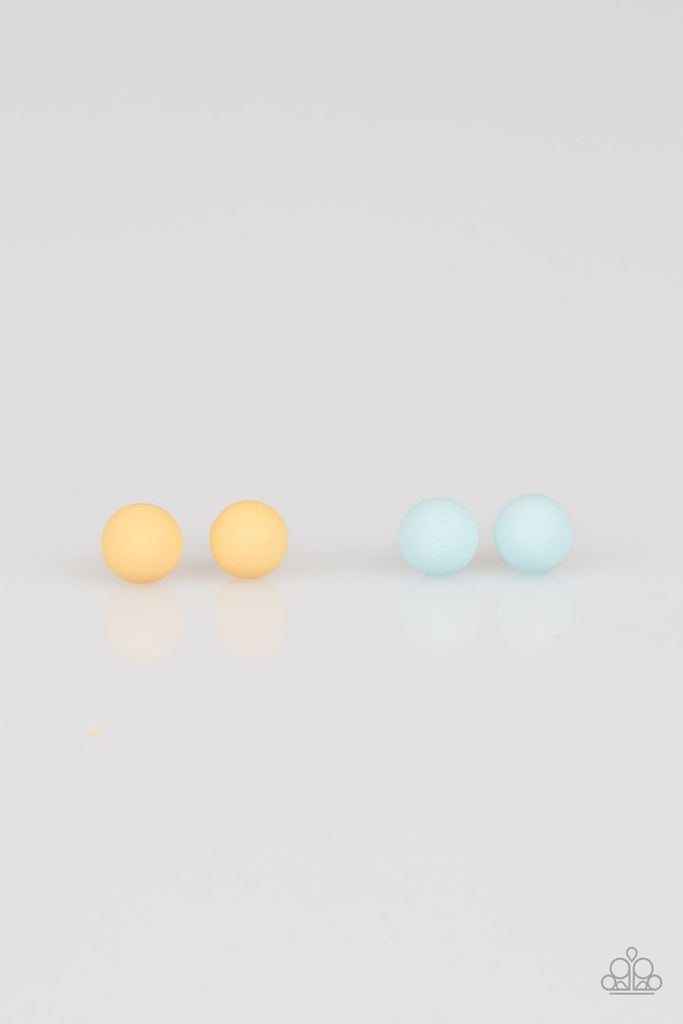 Round, pastel earrings on a post back fitting. Colors include white, light blue, light pink, yellow and orange.