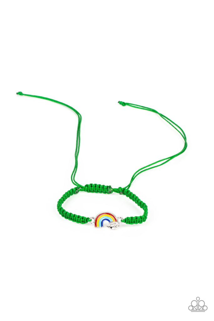 The green corded bracelets feature St. Patrick's Day inspired centerpieces that include a rainbow, a horseshoe, "lucky" charm, "Kiss Me" charm, and clovers. Bracelets feature adjustable sliding knot closures.