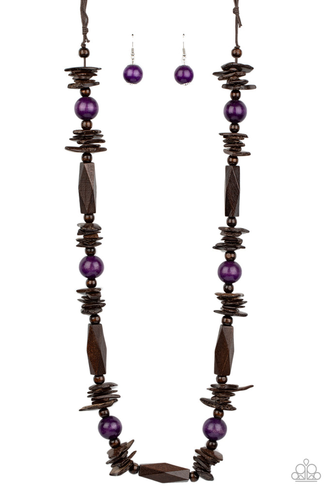 Featuring round, faceted, and distressed finishes, mismatched brown wooden beads are threaded along shiny brown cording. Vivacious purple wooden beads trickle between the earthy accents, adding a colorful finish to the summery palette. Features an adjustable sliding knot closure.
