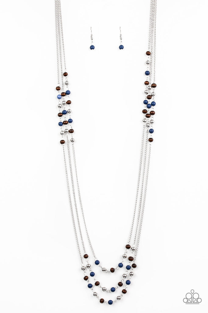 Dainty silver, blue, and wooden beads trickle along three shimmery silver chains, creating colorful layers across the chest. Features an adjustable clasp closure.
